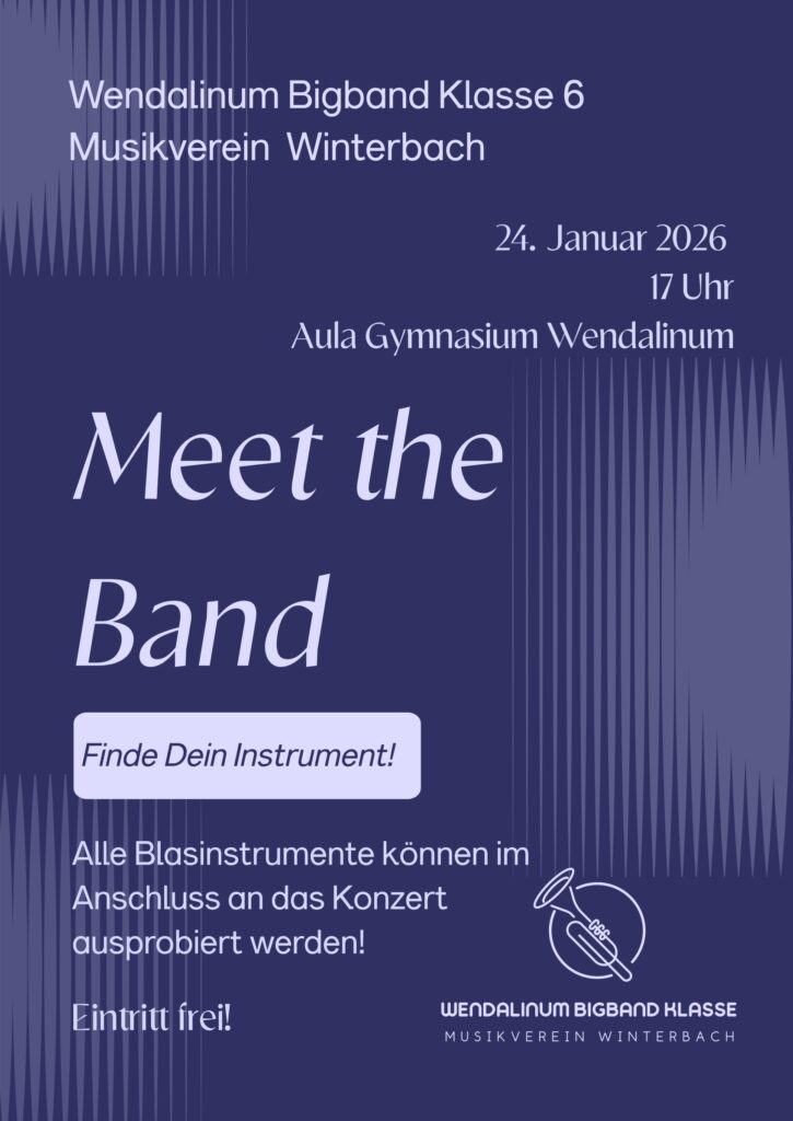 Die Wendalinum Bigband Klasse und der Musikverein Winterbach laden am Samstag, 24.Januar 2026 um 17 Uhr alle Musikinteressierten und alle, die ein Musikinstrument ausprobieren wollen zu einem kleinen Konzert in die Aula des Gymnasium Wendalinum ein.