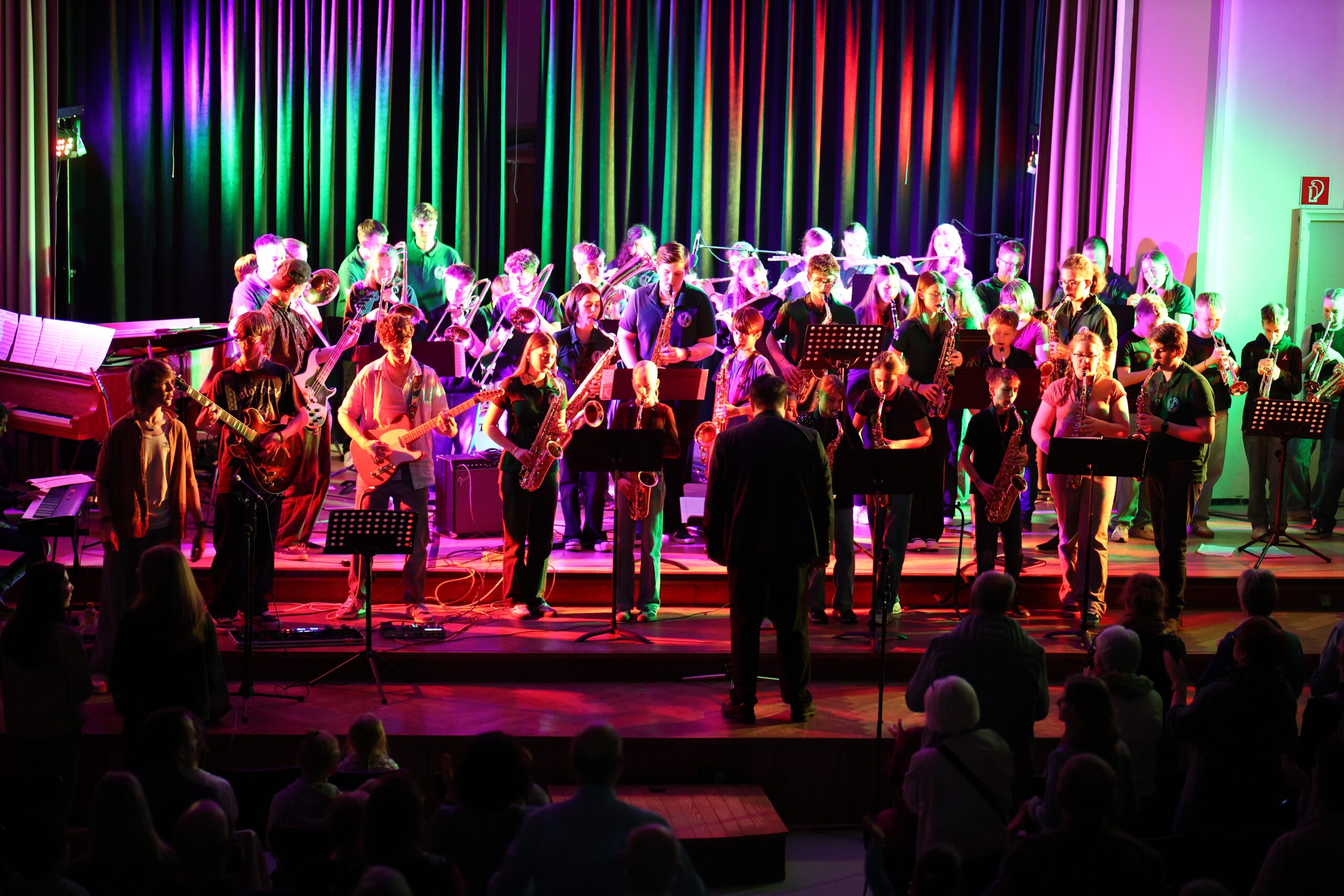 Anschließend steuerte das Konzert auf einen weiteren Höhepunkt zu, den Auftritt des „Wendalinum Jazz-Orchesters“. Unter Leitung von Thomas Zimmermann erklangen der Rocky-Soundtrack „Gonna fly now“, das rhythmisch sehr anspruchsvolle „Reptile“ sowie der Duke Ellington-Standard „Caravan“. Die Darbietung wurde vom Publikum mit kräftigem Applaus belohnt. Zudem stellte Zimmermann heraus, dass über die Hälfte der Musiker/innen des „Wendalinum Jazz-Orchesters“ selbst einmal in der Big Band-Klasse das Instrumentalspiel begonnen haben – ein eindrücklicher Beweis für die Nachhaltigkeit dieser Art des Musikunterrichts.