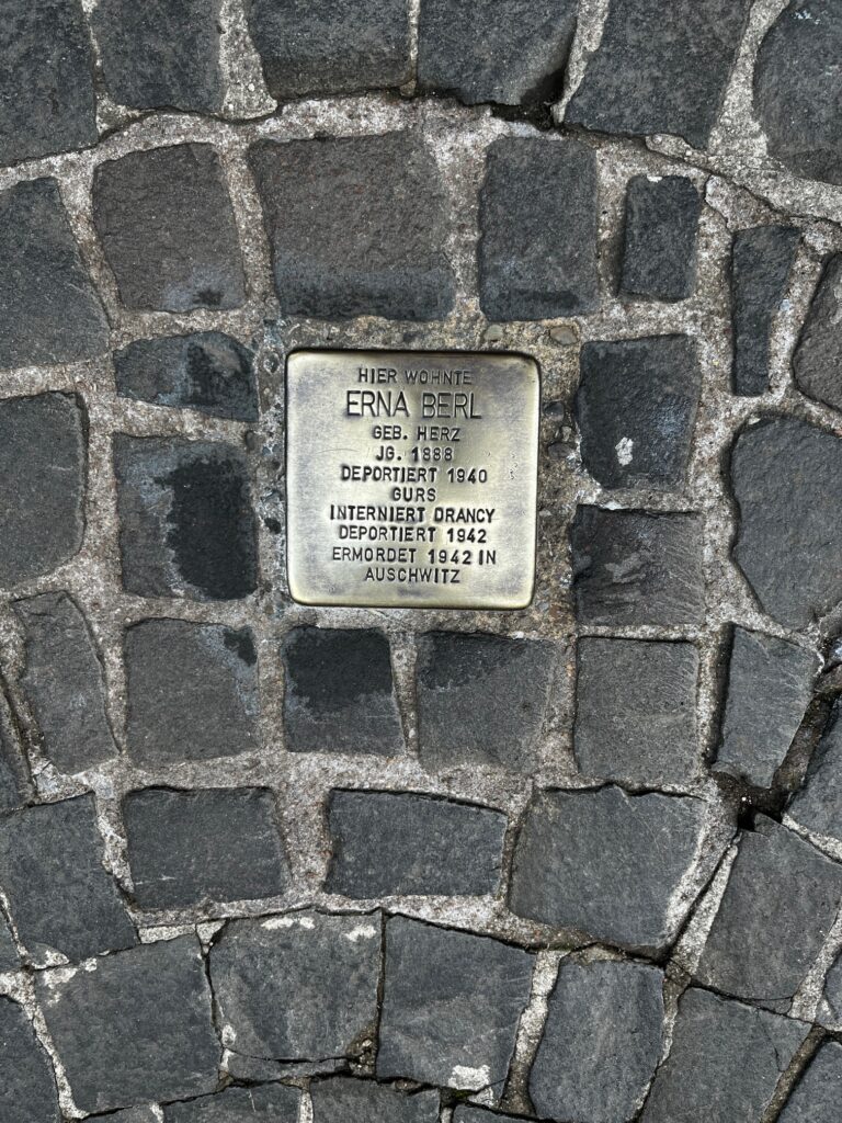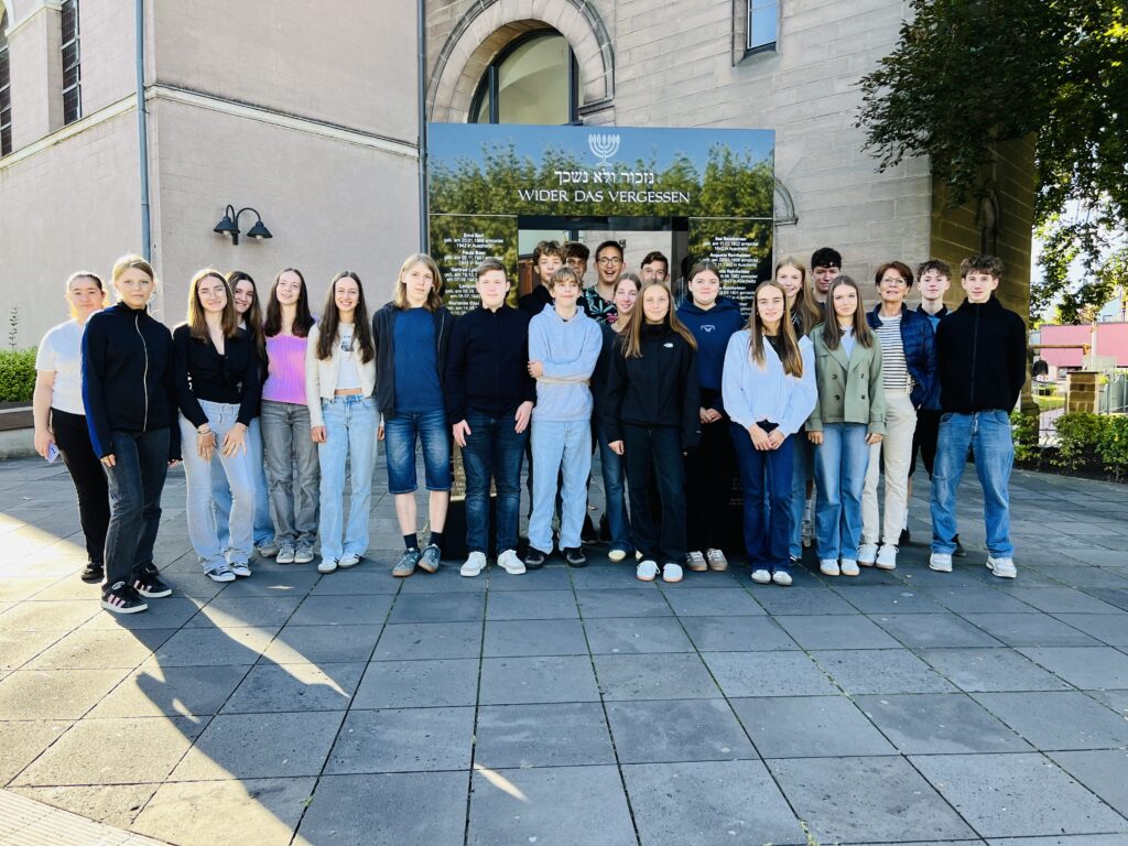 Ein Höhepunkt des Aktionstages war die Exkursion zu bedeutenden Erinnerungsorten in St. Wendel. So besuchten die Jugendlichen das ehemalige Elternhaus von Fritz Berl in der Schlossstraße 6/8, wo einige von ihnen den Stolperstein seiner Mutter Erna Berl mit Sorgfalt reinigten. Anschließend führte der Weg zur Gedenkstelle am Eugen-Berl-Platz neben der evangelischen Kirche – einem der „Sieben Orte gegen das Vergessen“ – sowie zur neuen Gedenkstätte für die ehemaligen jüdischen Mitbürgerinnen und Mitbürger auf dem Vorplatz der Kirche.
