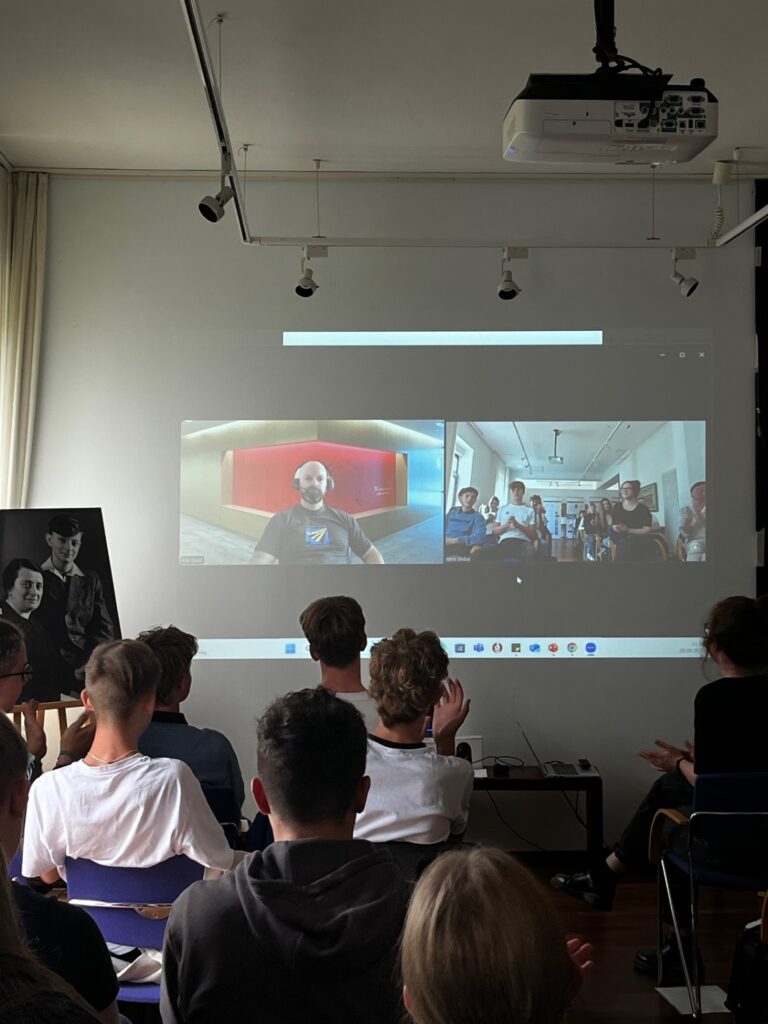 Mit großer Spannung erwarteten alle das Gespräch mit dem Enkel von Fritz Berl. Während der Videoübertragung nach Haifa stellten die Jugendlichen zahlreiche Fragen – über die bewegte Lebensgeschichte seines Großvaters, über sein eigenes Leben heute, seine Beziehung zu Deutschland und seine Sicht auf die aktuelle Situation in Israel.