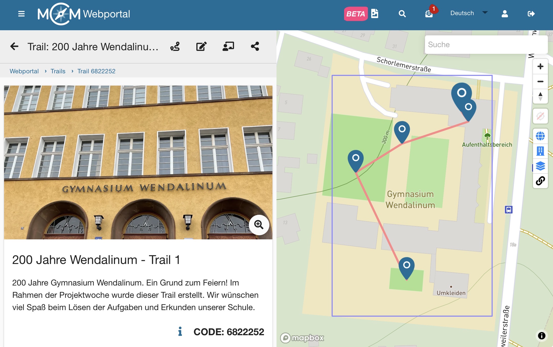 4. Aufgabenerstellung in der MathCityMap-App. Mit dieser App können Schüler, Lehrer und Einzelpersonen ihre Umwelt aus mathematischer Sicht entdecken. Die mathematische „Schnitzeljagd“ kann auf fünf Mathematikpfaden im und am Wendalinum oder auf einem Pfad in der St. Wendeler Innenstadt durchgeführt werden.