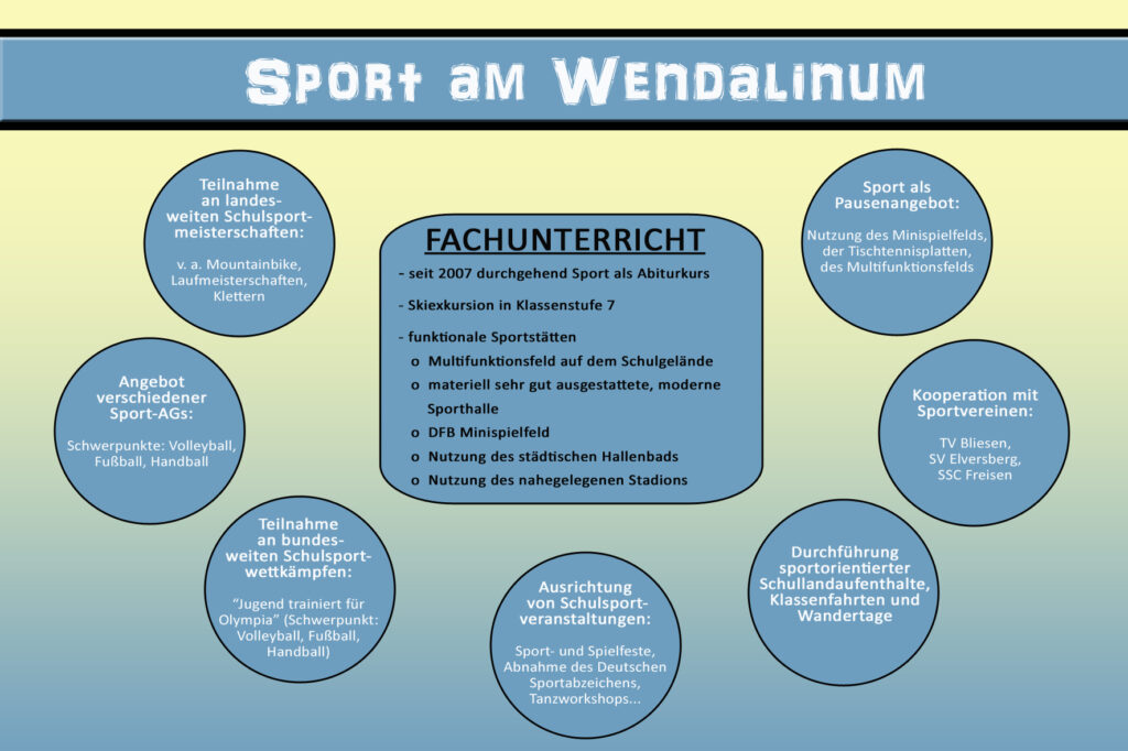 Bewegung, Teamgeist und Freude am gemeinsamen Lernen stehen im Zentrum unseres Sportunterrichts. Am Gymnasium Wendalinum bieten wir unseren Schülerinnen und Schülern ein vielfältiges und modernes Sportprofil, das weit über den regulären Unterricht hinausgeht. Durch hochwertige Sportanlagen, erlebnisorientierte Projekte und ein breites außerunterrichtliches Angebot fördern wir motorische Kompetenzen, stärken soziale Fähigkeiten und unterstützen eine aktive, gesunde Lebensweise. Ob im regulären Unterricht, bei spannenden Exkursionen wie der jährlichen Skifahrt, bei sportlichen Wettbewerben oder in unseren AGs – unser Ziel ist es, Begeisterung für Bewegung zu wecken und sportliche Talente zu fördern.